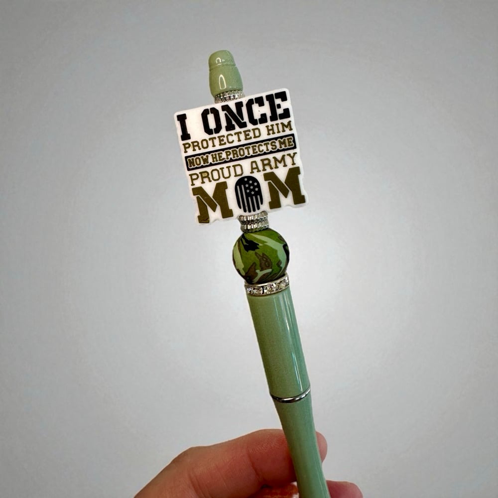 Pens are plastic with a variety of beads made from silicone, acrylic, or rhinestones.